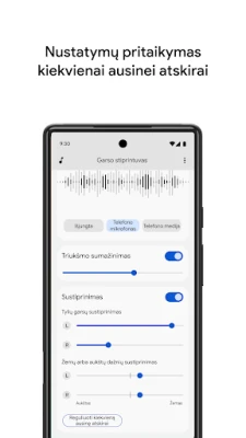 Su „Garso stiprintuvu" galite pritaikyti klausymosi patirtį pagal savo individualius poreikius. Įjunkite specialų pokalbio režimą (pasiekiamą „Pixel 3" ir naujesniuose įrenginiuose) ir sutelkite dėmesį išskirtinai į kalbėtojo balsą, net ir didelėje minioje. Be to, programa suteikia galimybę asmeniškai reguliuoti aplinkos garsus: sustiprinti žemus ar aukštus dažnius, paryškinti tylius garsus arba dar labiau sumažinti foninį triukšmą. Nustatymus galite pritaikyti tiek abiem ausims vienu metu, tiek kiekvienai ausiai atskirai, užtikrinant tobulą balansą.