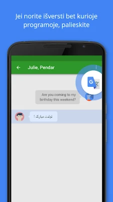 „Google" vertėjas siūlo greitą ir patikimą vertimą į 108 kalbas. Verskite tekstą rašydami, naudodami kamerą ar net neprisijungę. Palieskite ir išverskite tekstą bet kurioje programoje, išsaugokite frazes bei lengvai bendraukite įvairiomis kalbomis.