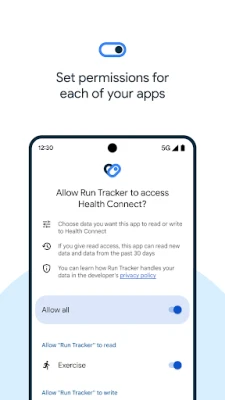 Visi jūsų brangūs sveikatos ir sporto duomenys saugiai saugomi vienoje vietoje, tiesiogiai jūsų įrenginyje ir neprisijungus prie interneto. Tai reiškia, kad galite lengvai tvarkyti ir peržiūrėti visų savo programėlių informaciją centralizuotai, be jokių rūpesčių dėl duomenų fragmentacijos. „Health Connect" suteikia jums absoliučią kontrolę – prieš suteikdami naujai programėlei prieigą, galite peržiūrėti ir tiksliai nurodyti, kas gali būti bendrinama. Bet kuriuo metu galite patikrinti, kurios programėlės neseniai naudojosi jūsų duomenimis, ir koreguoti nustatymus, užtikrinant jūsų privatumą ir ramybę.