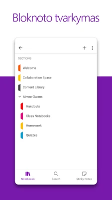 „OneNote" leidžia fiksuoti mintis įvairiais būdais: spausdinant, rašant ranka, piešiant ar pridedant turinį iš interneto. Organizavimo įrankiai, tokie kaip sekcijos, puslapiai ir žymės, padeda tvarkyti pastabas mokyklai, namams ar darbui. Skaitmenizuokite ir paverskite rankraščius ieškomais. Naudokite jį kaip universalų užrašų bloknotą.