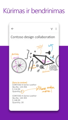 Niekada nepraleiskite progos pasiekti daugiau, dirbdami vienas ar bendradarbiaudami su komanda. „OneNote" suteikia galimybę dalintis užrašais ir dirbti kartu realiuoju laiku, sinchronizuojant turinį tarp visų jūsų įrenginių. Dalyvaukite komandos susitikimuose, lengvai generuokite idėjas, pažymėkite svarbiausius klausimus ir centralizuokite išteklius, užtikrindami, kad visa komanda visada kalbėtų ta pačia kalba. Nesvarbu, ar naudojate „Android", „Apple", ar „Windows" įrenginį – jūsų užrašai visada bus su jumis ir pasiekiami kitiems. Be to, „OneNote", būdamas „Office" programų šeimos narys, sklandžiai integruojasi su „Excel" ir „Word", dar labiau padidindamas jūsų produktyvumą ir leidžiantis greitai fiksuoti mintis naudojant patogų ženklelį ekrane, net naršant internete ar kalbant telefonu.